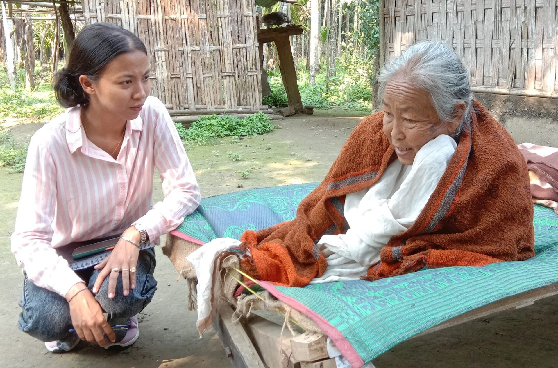 In Basagoan I and my Aaranyak colleagues met an elderly woman sitting, hunched and glum, on an outdoor bed. She seemed older than me but was, in fact, younger. Her name was Menuma Gagoi. She lived with her husband, Bedachandra, in a small wooden house on stilts. Its walls were made of woven bamboo. They lived alone because – unusual in India – they had no children. They depend on neighbours for help.